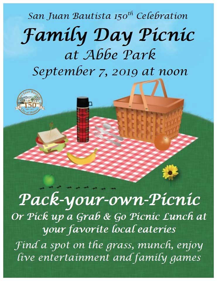 12:30pm (-ish): Family fun/picnic day in Abbe Park: games and live entertainment featuring folkloric dancing, Gilroy Ukulele Jammers, Alta California Dance Co., Zack Frietas (3pm) and SOMOS (4pm)!